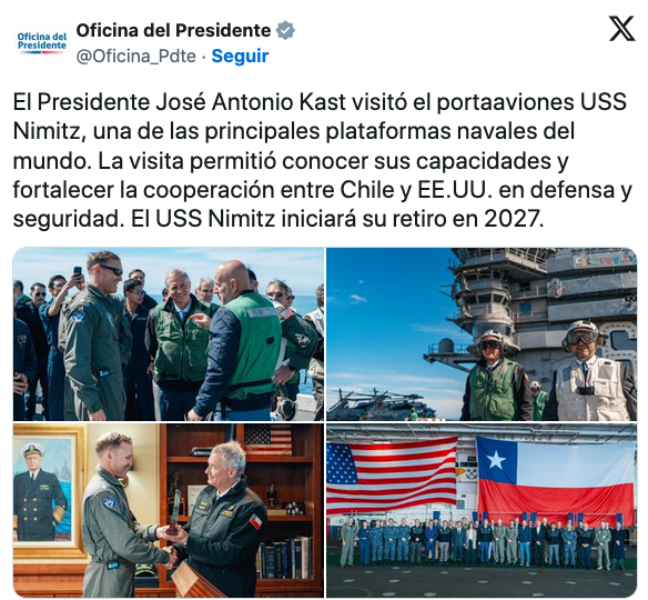 La publicación va acompañada del mensaje «el Presidente José Antonio Kast visitó el portaaviones USS Nimitz, una de las principales plataformas navales del mundo. La visita permitió conocer sus capacidades y fortalecer la cooperación entre Chile y EE.UU. en defensa y seguridad. El USS Nimitz iniciará su retiro en 2027».
