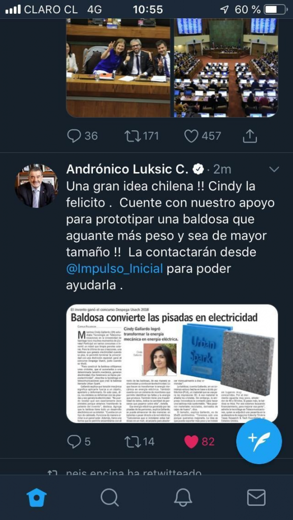 “Urban Spark” es el título del desarrollo liderado por la tecnóloga en telecomunicaciones de la Universidad de Santiago, Cindy Gallardo Villarroel, quien mediante el uso de material reciclado, elaboró una baldosa que permite generar electricidad aprovechando la energía que producen las personas mientras caminan.
