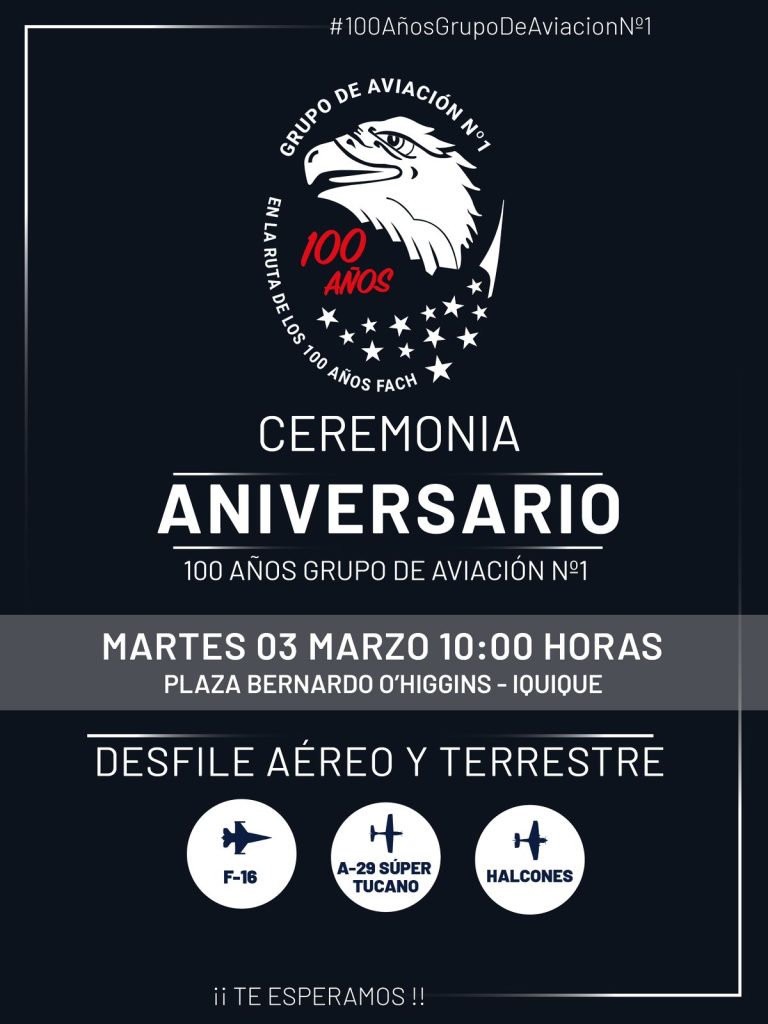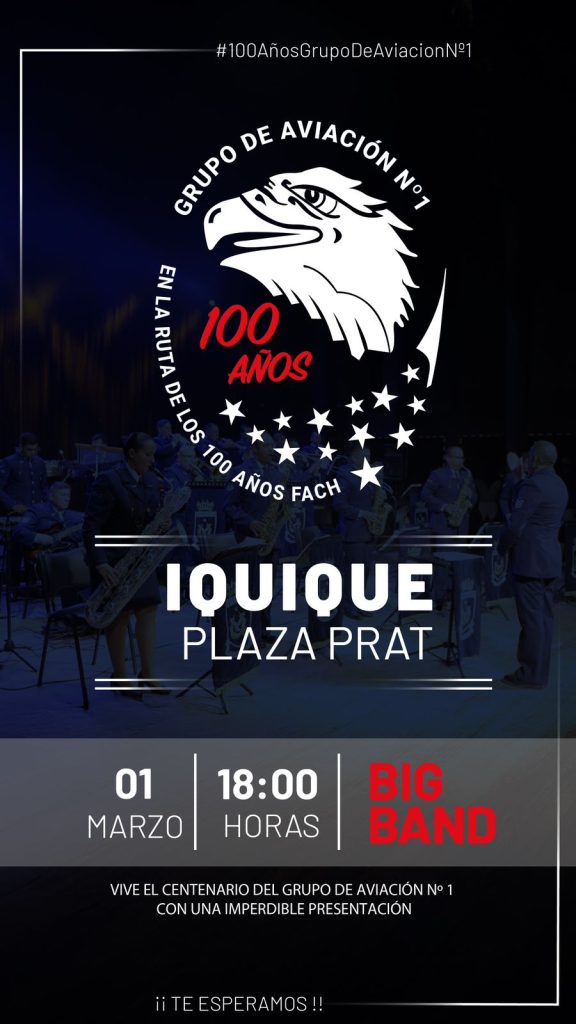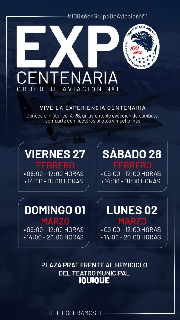 Este viernes 27 de febrero, en la Plaza Prat de Iquique, inicia la “Expo Centenario del Grupo de Aviación Nº1”, con motivo de las actividades del Centenario de la Unidad más antigua de la Fuerza Aérea de Chile. Este importante hito, dará inicio a las actividades en conmemoración a la Ruta del Centenario de la FACH para el 2030.