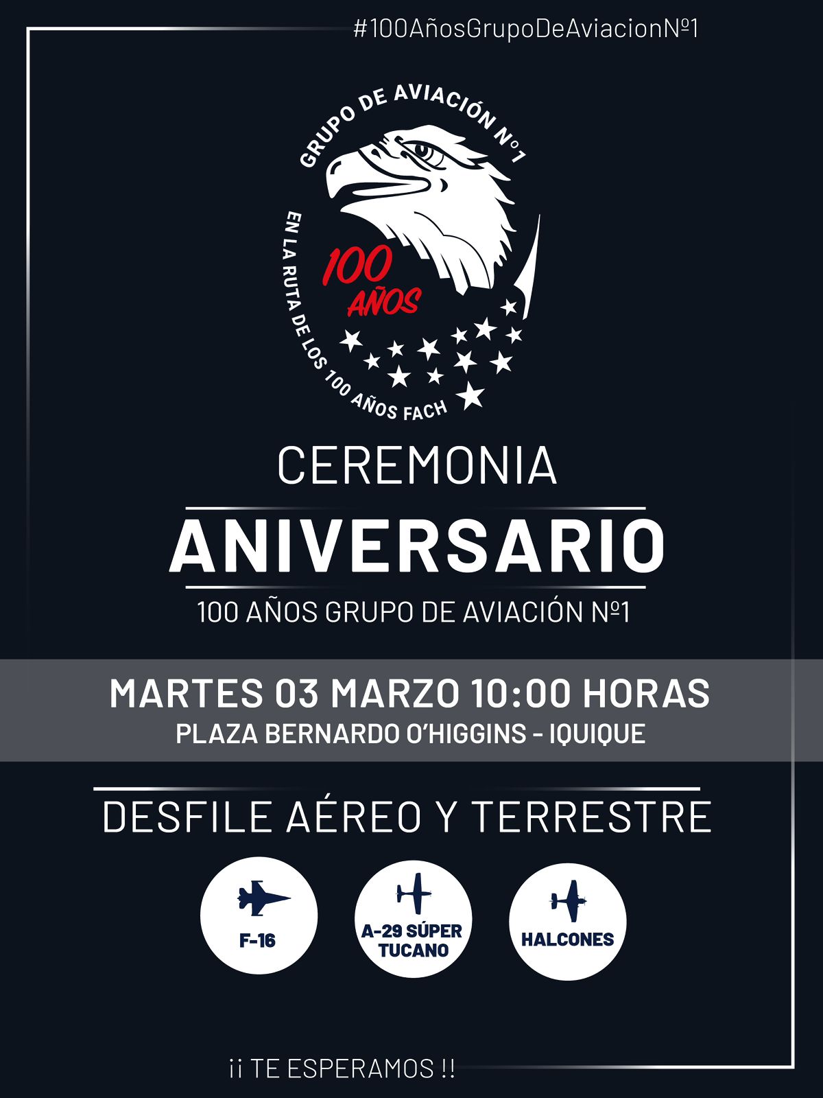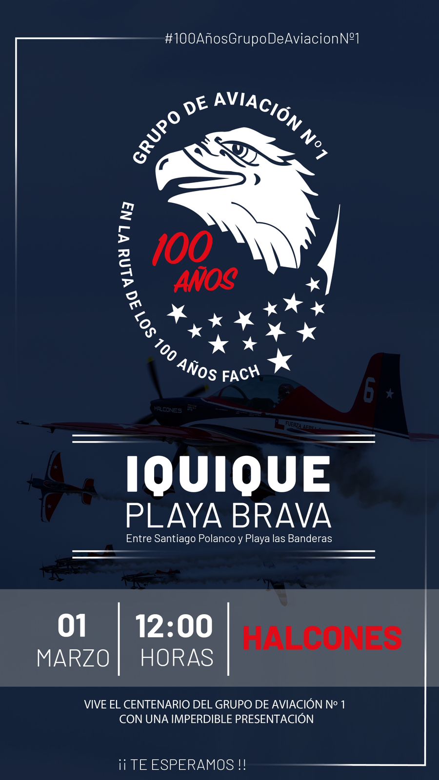 Con esta muestra, la Fuerza Aérea de Chile, da inicio a las diversas actividades que tiene preparado para conmemorar el Centenario del Grupo de Aviación Nº1, donde también, la comunidad podrá disfrutar del espectáculo de primer nivel de la Escuadrilla de Alta Acrobacia Halcones y la presentación artística de la Escuadrilla de Bandas con la Big Band de la Institución.