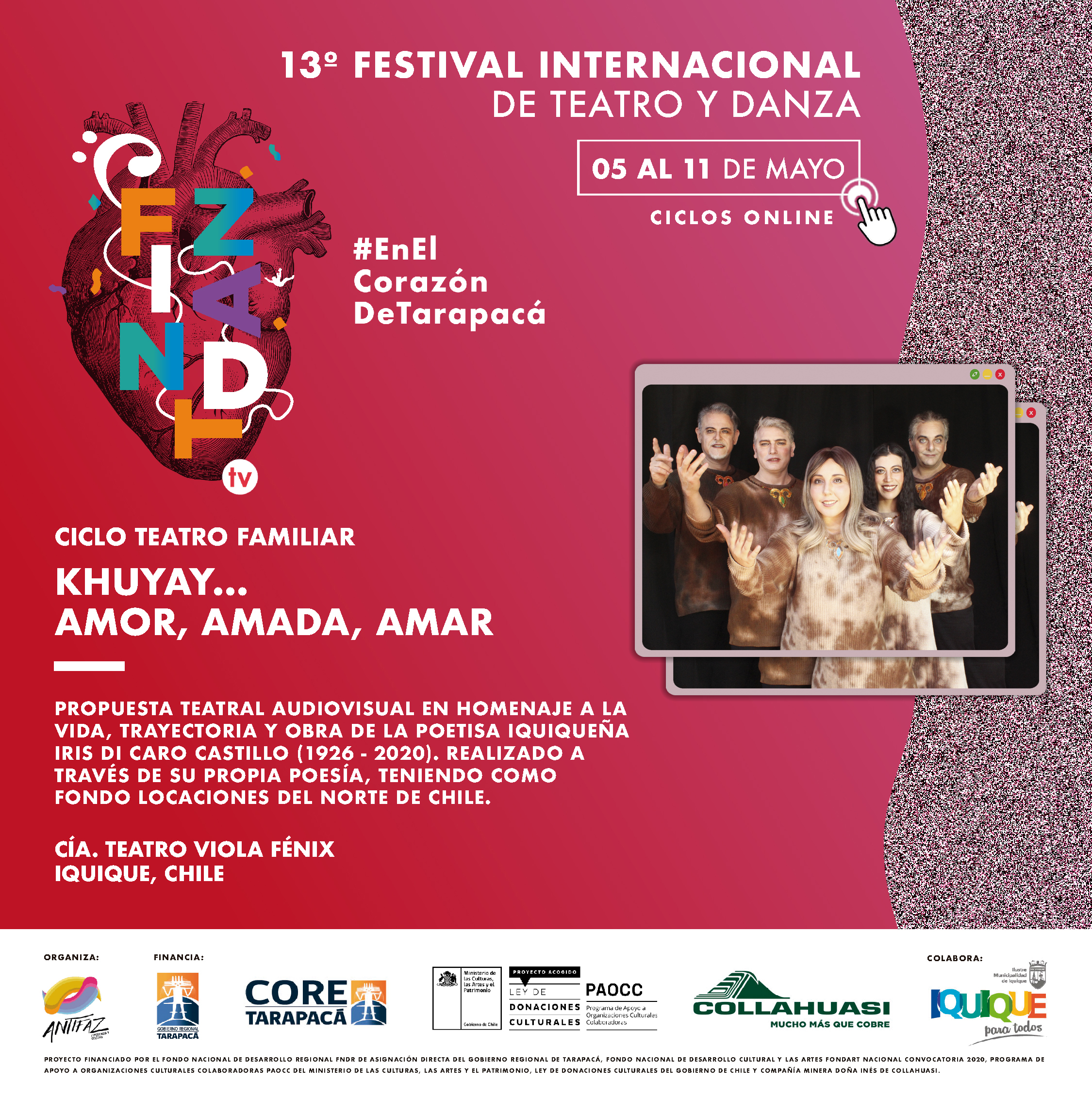 En FINTDAZ Ciclos On Line 2021, seguimos acompañándote congrandes espectáculos de Teatro, Danza, Artes Circense, Podcast, Lecturas Dramatizas, Actividades Formativas y mucho más, para el disfrute de grandes y chicos, y de toda la familia, conéctate gratuitamente a través de la pantalla de tu celular, notebook o computador.
