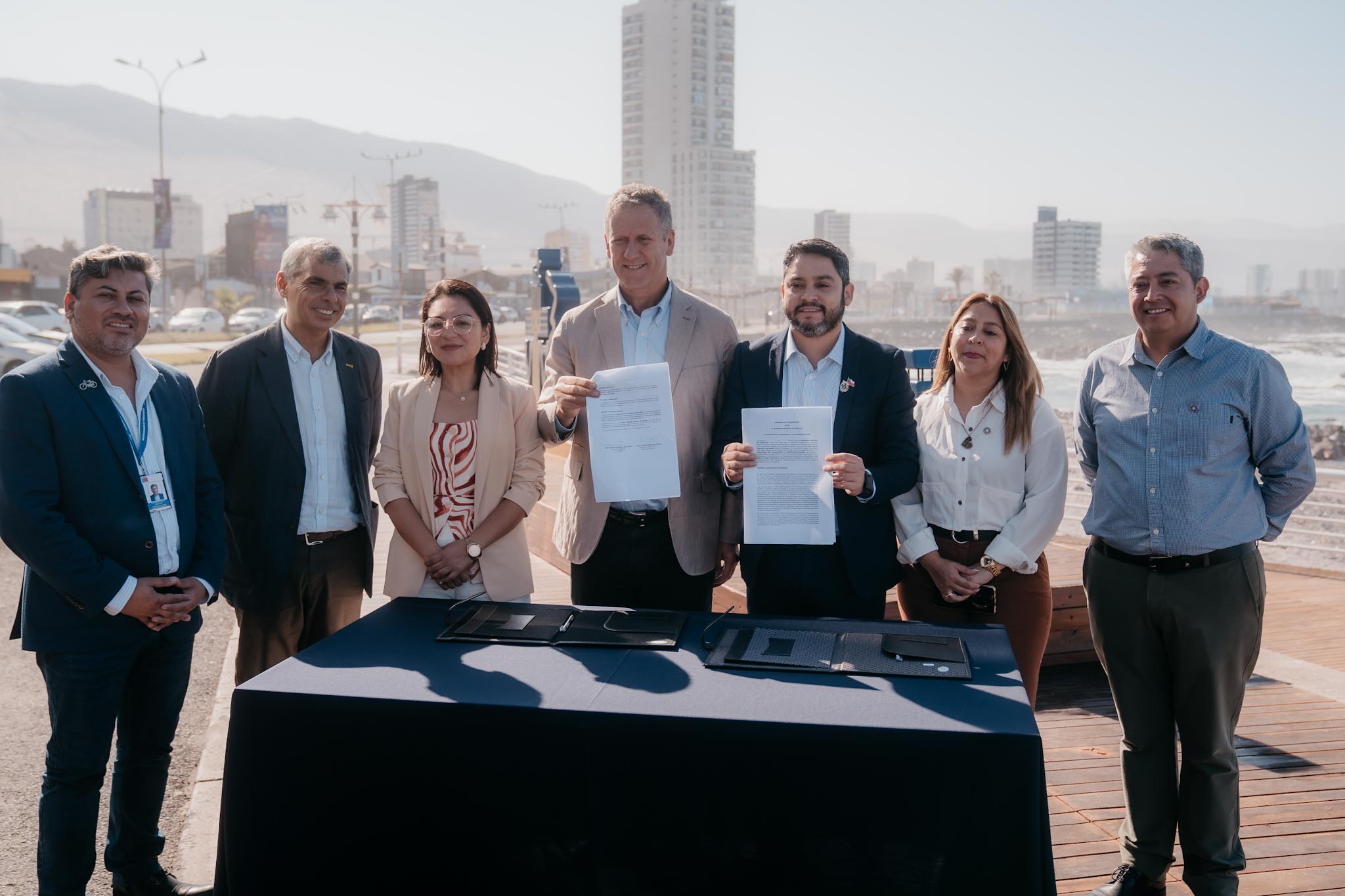 Desde el mirador Tarapacá, el ministro de Transporte y Telecomunicaciones, Juan Carlos Muñoz y el Gobernador José Miguel Carvajal, firmaron el convenio de colaboración que permitirá gestionar, concretar acciones y coordinar las inversiones necesarias del proyecto de adquisición de 88 buses eléctricos en el Área Metropolitana Alto Hospicio – Iquique.