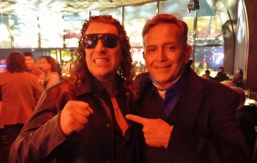 Rodrigo Miranda con el cantante top Leo Rey compartiendo gratos momentos en la cena anual de la Sociedad Chilena de Autores e Intérpretes Musicales (SCD).