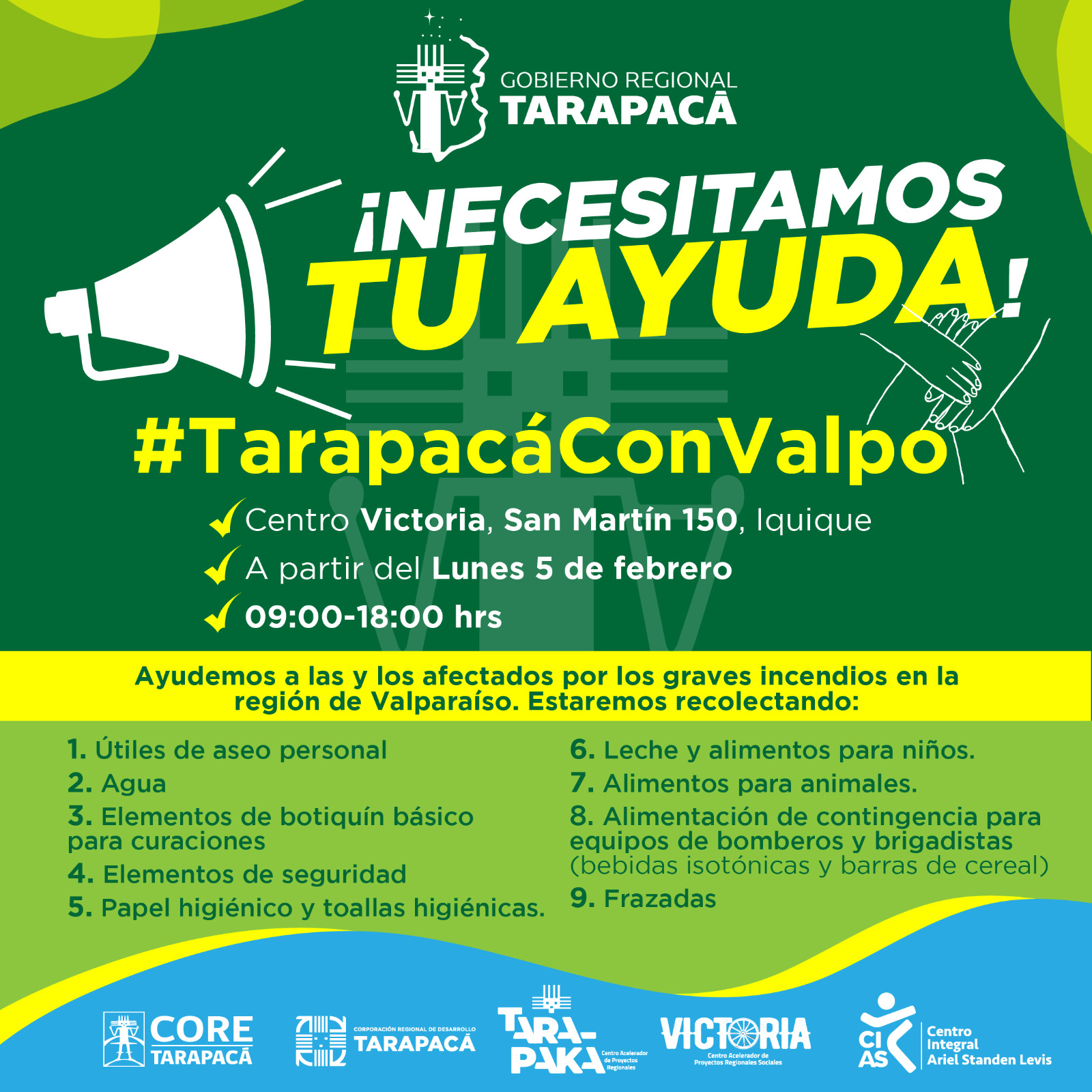 La autoridad hizo un llamado a todos los vecinos y vecinas de Tarapacá, al igual que a los municipios, para concentrar la ayuda en el centro de acopio dispuesto en el Centro Victoria, para, desde ese lugar, partir hacia la región de Valparaíso.