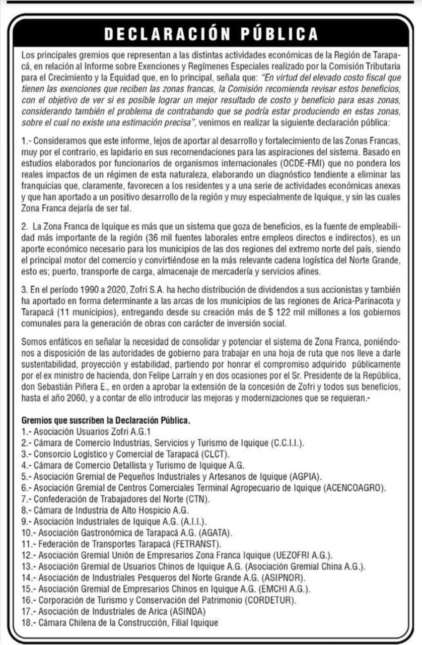 Dieciocho gremios de la Primera Región de Tarapacá firman la Declaración Pública, donde manifiestan que el informe sobre Exenciones y Regímenes Especiales Comisión Tributaria para el Crecimiento y la Equidad, es lapidario y está lejos de aportar al desarrollo y fortalecimiento de las Zonas Francas (Iquique y Punta Arenas).