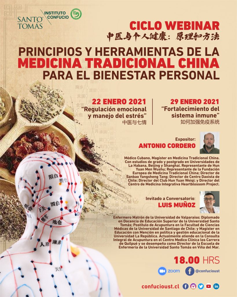 Ambas citas serán gratuitas a través de Zoom y Facebook Live (@confucioust) a las 18:00 horas con el médico cubano y Magíster en Medicina Tradicional China, Antonio Cordero, como expositor y el director de la Escuela de Enfermería de la Universidad Santo Tomás, Luis Muñoz, como invitado al conversatorio.