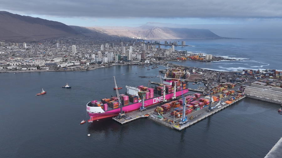 - Buque transfirió más de 1.600 contenedores durante su primera recalada en Chile y tiñó de magenta el puerto de Iquique.