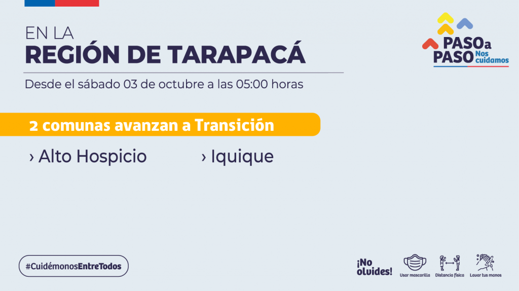 El Ministerio de Salud informó que en la Región de Tarapacá se entra al Paso 2 - Transición, a partir del sábado 3, a las 05:00 hrs, comunas de Alto Hospicio e Iquique.