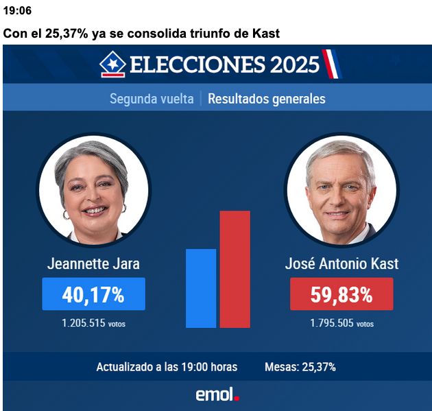 19:09 Récord de Kast Con 25,37% de las mesas escrutadas, José Antonio Kast sigue teniendo los máximos históricos en segunda vuelta para la derecha en todas las regiones, excepto Atacama, donde queda por debajo de Piñera 2017.