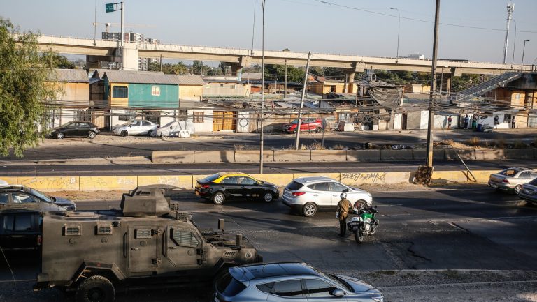 Las dos partes de la toma. El campamento Vicente Reyes, en el que viven unas 690 familias, está ubicado a ambos costados de Camino a Melipilla, al llegar al cruce de Pajaritos. Las construcciones precarias rodean la ruta hasta casi el borde de la calzada.