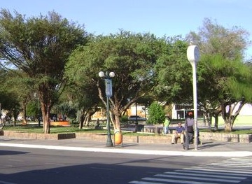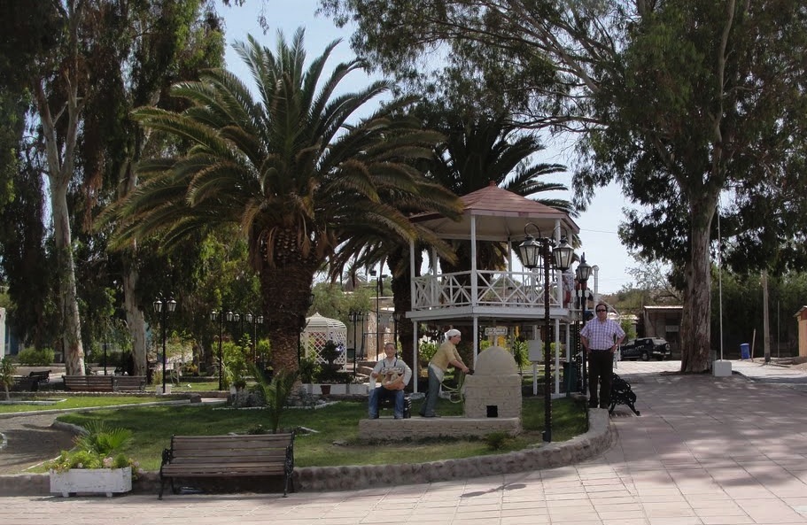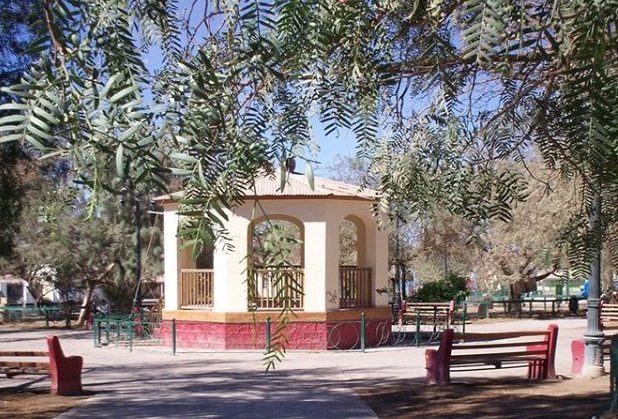 Otra de las plazas lindas es la de la Oficina María Elena (desde 1926), último bastión de la industria salitrera. Pese a la sequedad del territorio, la plaza elenina luce frondosos pimientos y algarrobos para capear el intenso calor pampino.