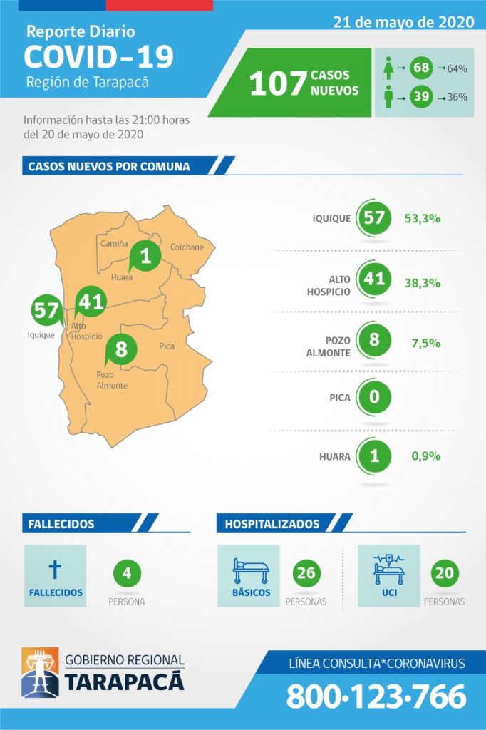 De esos 107 casos, 68 son mujeres y 39 hombres y pertenecen: 57 a la comuna de Iquique, 41 a Alto Hospicio, 8 a Pozo Almonte y 1 a Huara.