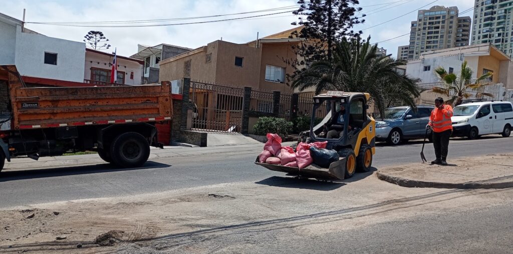 La tarea significó una mañana entera de limpieza y despeje de la arenas que se acumuló en sacos y posteriormente llegó personal con una mini pala mecánica que cargó (las bolsas) en un camión municipal.