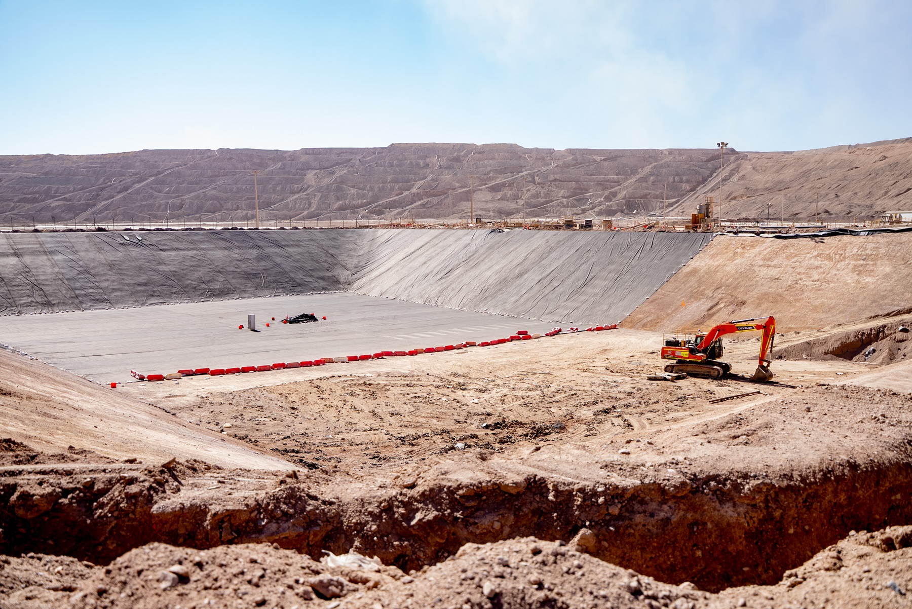 Actualmente, los trabajos se concentran en la Piscina de Emergencia, un hito técnico por sus dimensiones e interferencias operacionales: 14.800 m² de superficie y una capacidad de contención de 85.000 m³.