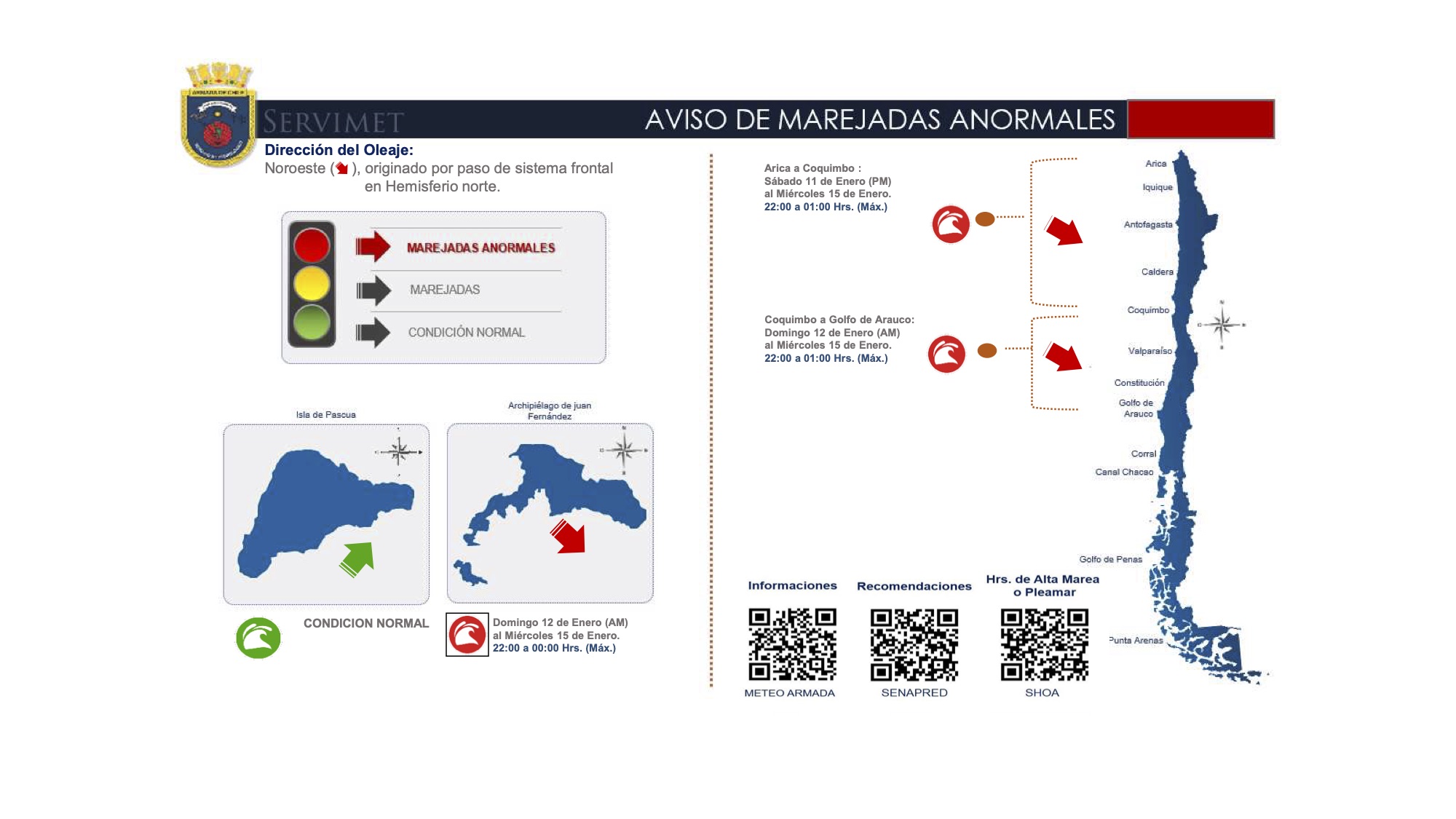 El Jefe del Centro Meteorológico Marítimo de Valparaíso, Capitán de Corbeta Felipe Rifo explicó que: «Un nuevo tren de olas provenientes del hemisferio norte afectará a contar del día sábado 11 de enero a nuestro litoral continental e insular, generando oleaje que se proyectará como marejadas del NOROESTE entre Arica y el Golfo de Arauco, incluyendo el Archipiélago Juan Fernández, produciendo fuerte rompiente, sobrepasos y potenciales daños a la infraestructura costera, principalmente en bahías del norte del país abiertas a esa dirección. Es por este motivo que hemos categorizado este evento como aviso de Marejadas Anormales. Esperamos que la condición más intensa se presente entre los días lunes 13 y martes 14 de enero, sobre todo en los horarios de pleamar o de más alta marea en especial entre las 22:00 y 01:00 hora local. Estas marejadas corresponden al cuarto aviso y es el segundo categorizado como Marejadas Anormales en 2025 para el sector continental”.