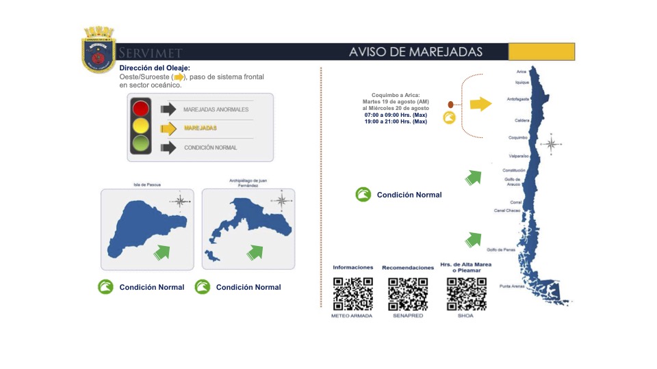 El jefe del Centro Meteorológico Marítimo de Valparaíso, Capitán de Corbeta Felipe Rifo Espósito explicó que: «debido a un sistema frontal que afectará el sector centro y norte del país, esperamos marejadas con dirección del oeste/suroeste a contar del día martes 19 de agosto en nuestro litoral, afectando desde Coquimbo hasta Arica, generando oleaje con rompiente en bahías abiertas a esa dirección. Se estima que su mayor desarrollo se presente durante las horas de pleamar o altas mareas, en particular entre las 7:00 y 9:00 hrs como marea primaria y entre las 19:00 y 21:00 hrs como pleamar secundaria. Estas marejadas corresponden al aviso número veinte que afecta a las costas continentalesdurante el presente año”.