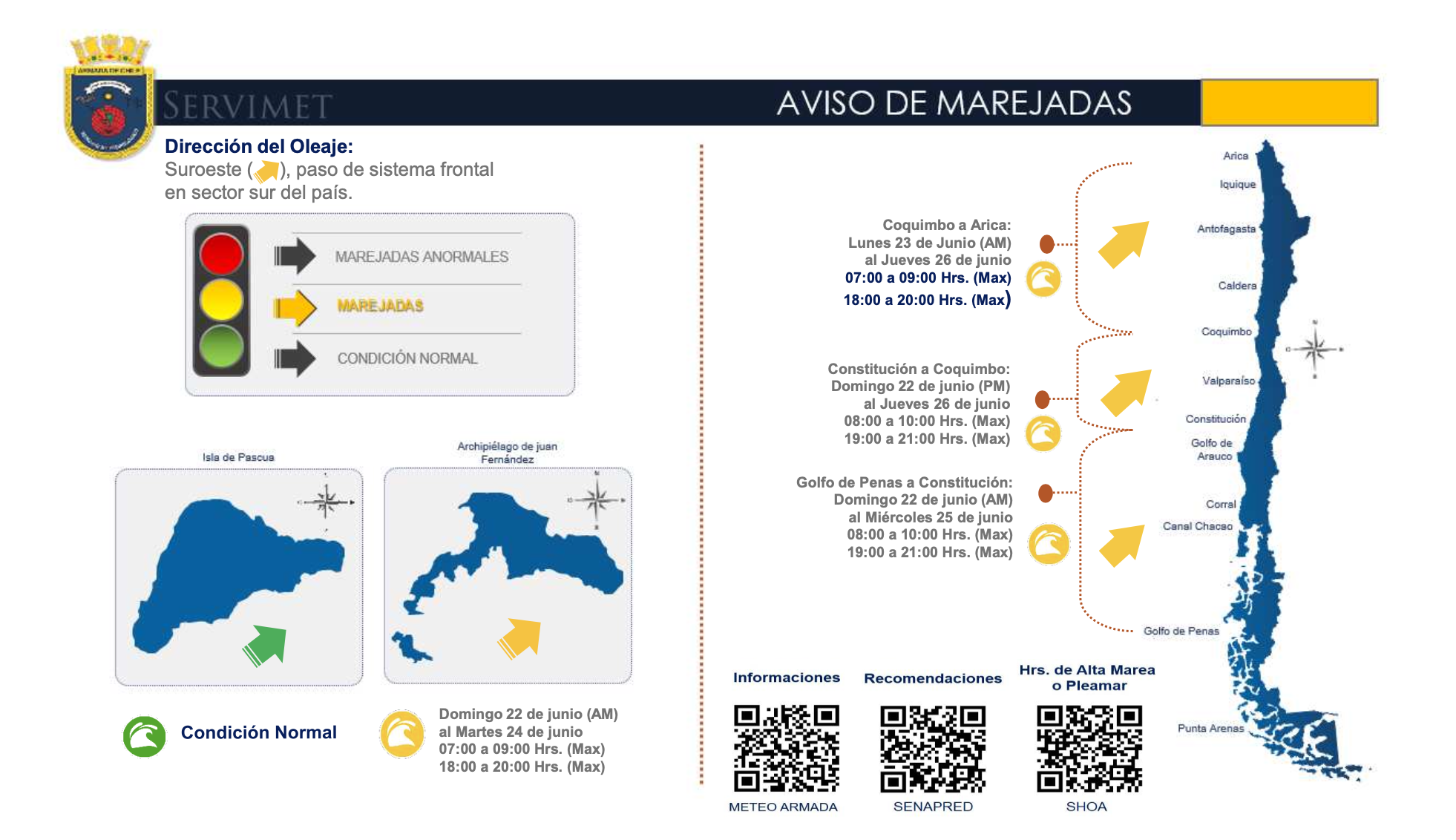 El Jefe del Centro Meteorológico Marítimo de Valparaíso, Capitán de Corbeta Felipe Rifo Espósito explicó que: «Debido a un activo sistema frontal que afectará el sector sur del país, esperamos marejadas con dirección del suroeste a contar del domingo 22 de junio en nuestro litoral, afectando desde Golfo de Penas hasta Arica, incluyendo el Archipiélago Juan Fernández, generando oleaje con rompiente en bahías abiertas a esa dirección. Se estima que su mayor desarrollo se presente durante las horas de pleamar o altas mareas, en particular entre las 07:00 y 10:00 hrs como marea primaria y entre las 18:00 y 21:00 hrs como pleamar secundaria. Estas marejadas corresponden al aviso número dieciséis que afecta a las costas continentales durante el presente año”.