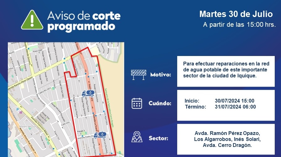 El cuadrante que se verá involucrado en el corte corresponde a Av. La Tirana con Av. Ramón Pérez Opazo y Presidente Eduardo Frei Montalva con Av. Cerro Dragón