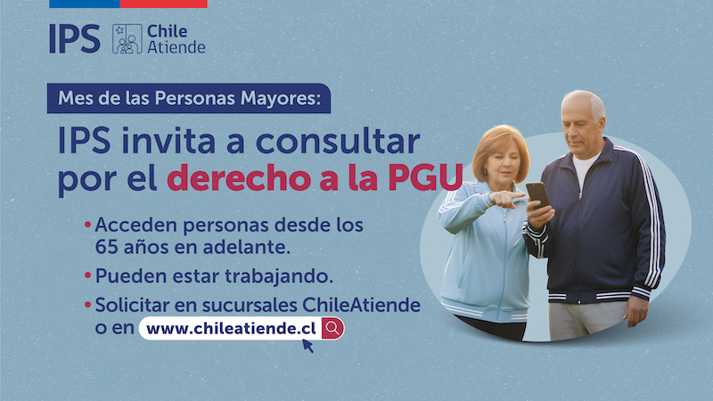 En el marco de esta nueva conmemoración, el Instituto de Previsión Social (IPS) hace un llamado a las personas desde los 65 años en adelante, que aún se encuentren trabajando o que ya estén jubiladas, para que consulten si tienen derecho a la Pensión Garantizada Universal en alguna de las 202 sucursales ChileAtiende del IPS en todo el país, por videoatención en www.chileatiende.cl o en línea en ese mismo sitio.