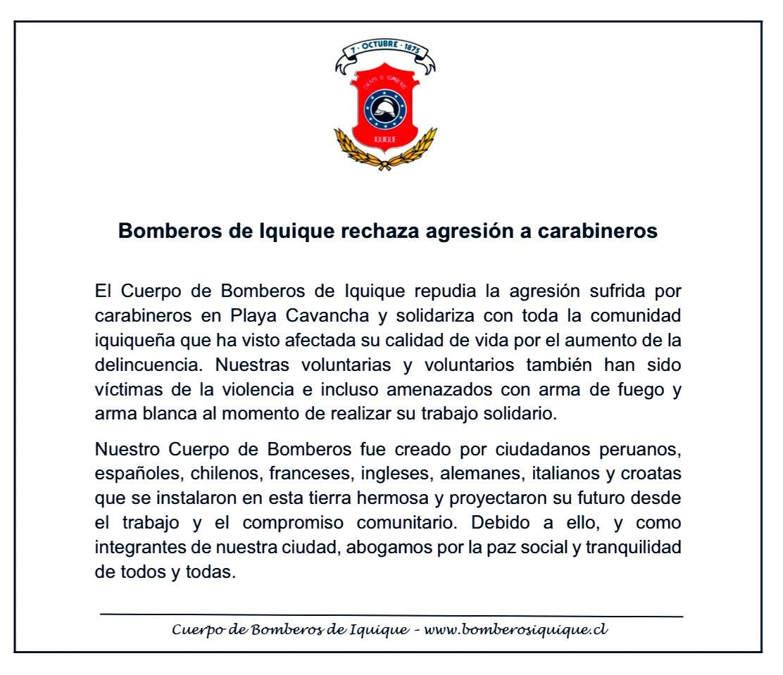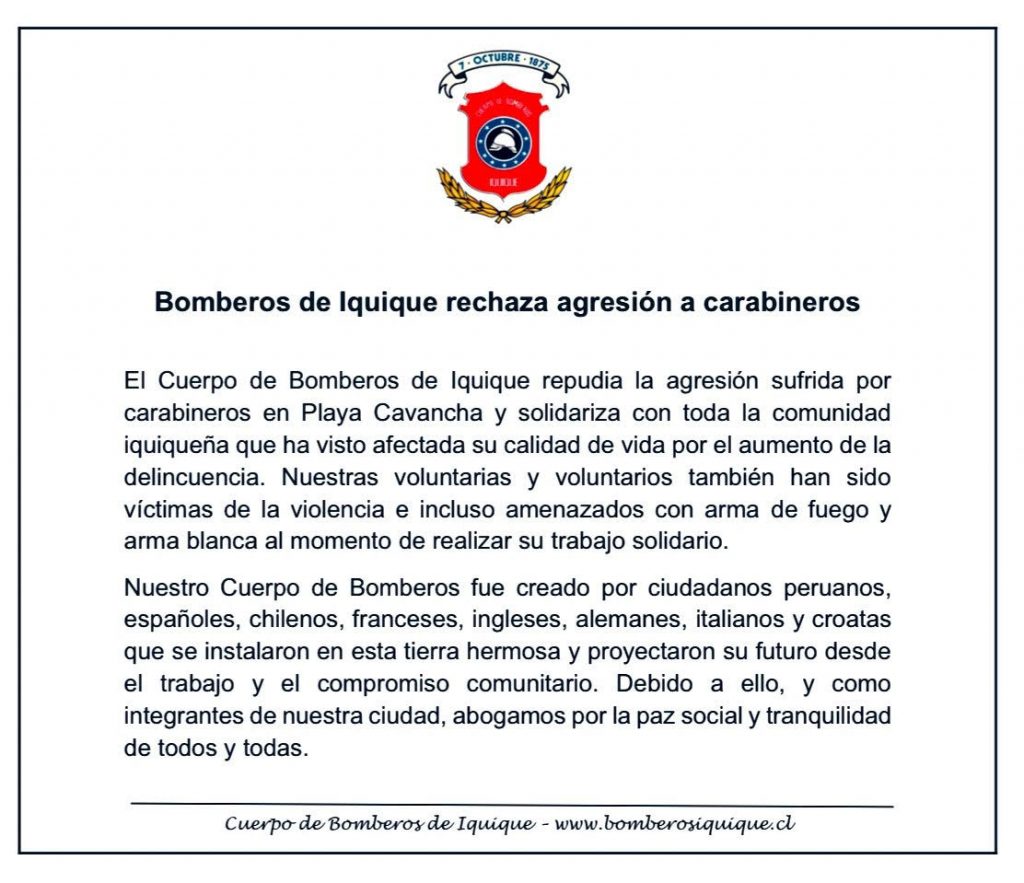 También el Cuerpo de Bomberos de Iquique manifestó con una declaración pública su respaldo a Carabineros.