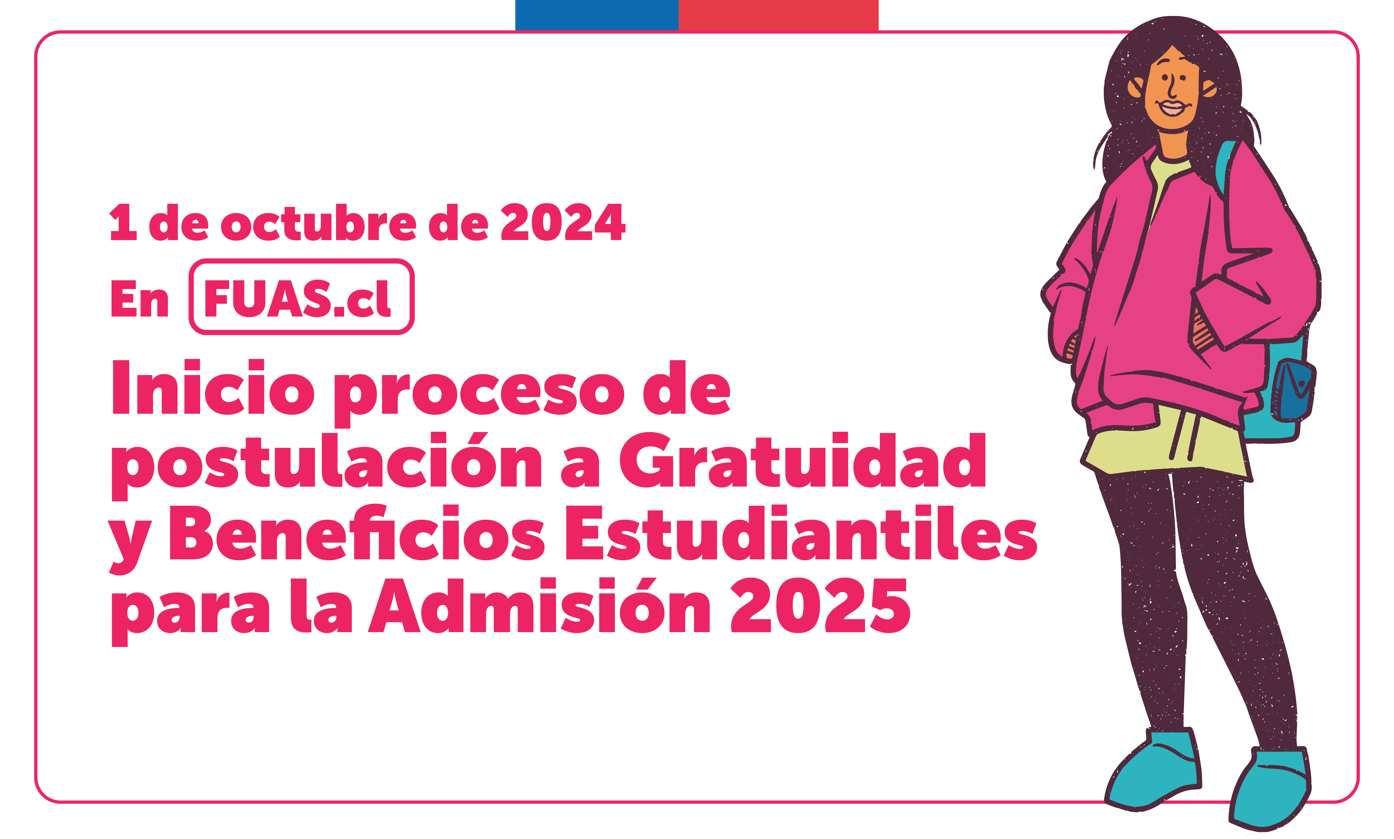 El Ministerio de Educación, a través de la Subsecretaría de Educación Superior, informó que entre el 1 y 22 de octubre de 2024 estará disponible el Formulario Único de Acreditación Socioeconómica (fuas.cl), para realizar la postulación a la Gratuidad y Beneficios Estudiantiles del Estado para la educación superior en su admisión 2025.