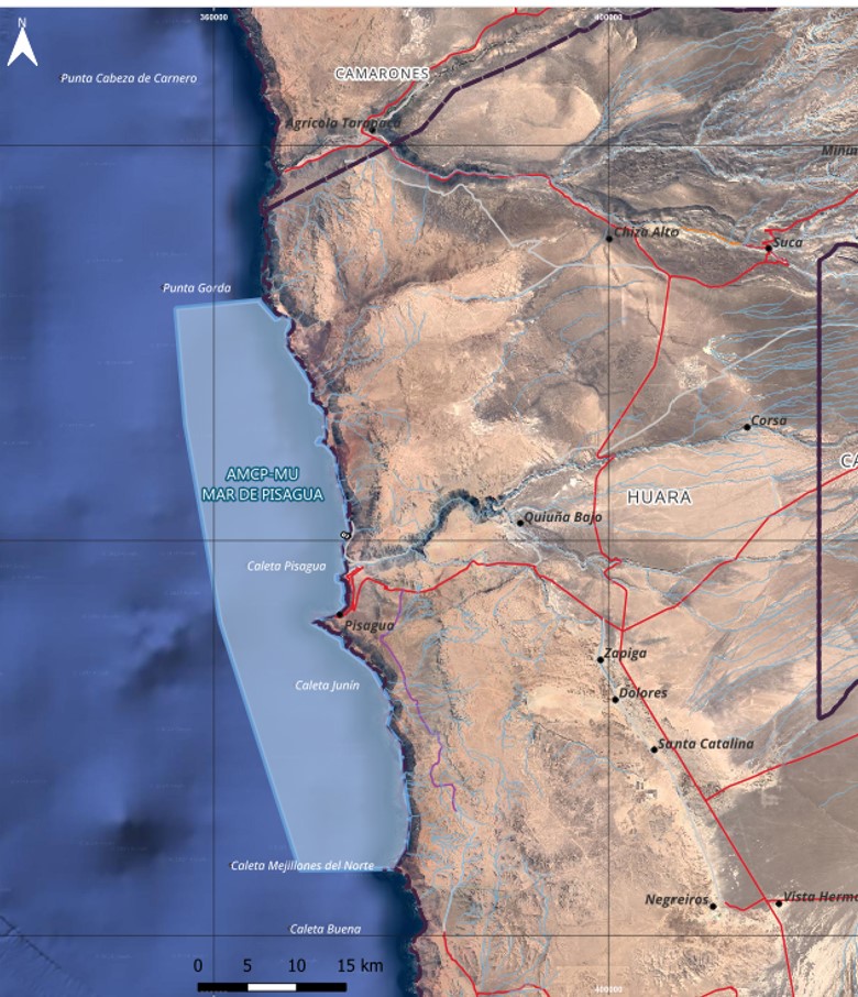 El área comprende una superficie aproximada de 734,6 kilómetros cuadrados frente a la costa de la comuna de Huara, en la provincia del Tamarugal, Región de Tarapacá.