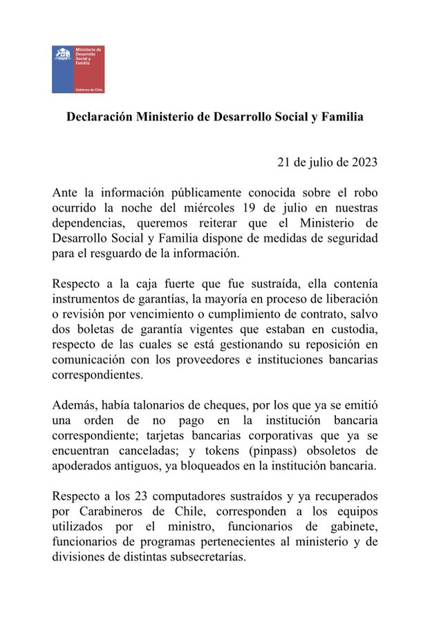 La tarde de este viernes, el Ministerio de Desarrollo Social (Mideso) emitió un comunicado en relación al robo del que fue víctima, en donde sujetos engañaron a los guardias del recinto y robaron 23 computadores (ya recuperados) y una caja fuerte.