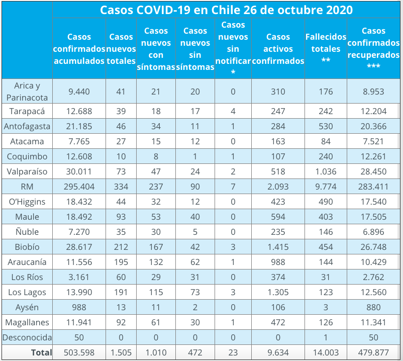 En tanto, el reporte detalla que hubo 1.505 casos nuevos de covid-19, de los cuales 1.010 corresponden a personas sintomáticas y 472 no presentan síntomas. La cifra total de personas que han sido diagnosticadas con covid-19 en el país alcanza a las 503.598. En tanto, los casos recuperados son 479.877, y los casos activos, es decir, quienes pueden contagiar a otros, son 9.634. A la fecha, 730 personas se encuentran hospitalizadas en Unidades de Cuidados Intensivos, y 91 se encuentran en estado crítico de salud. Con relación a la Red Integrada de Salud, existe un total de 374 ventiladores disponibles.