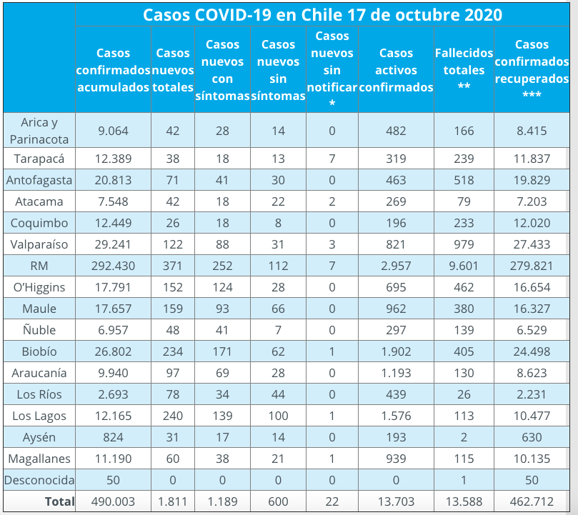 Con esto, la cifra total de fallecidos llega a 13.588 y la de casos a 490.003 desde que comenzó la pandemia en Chile.