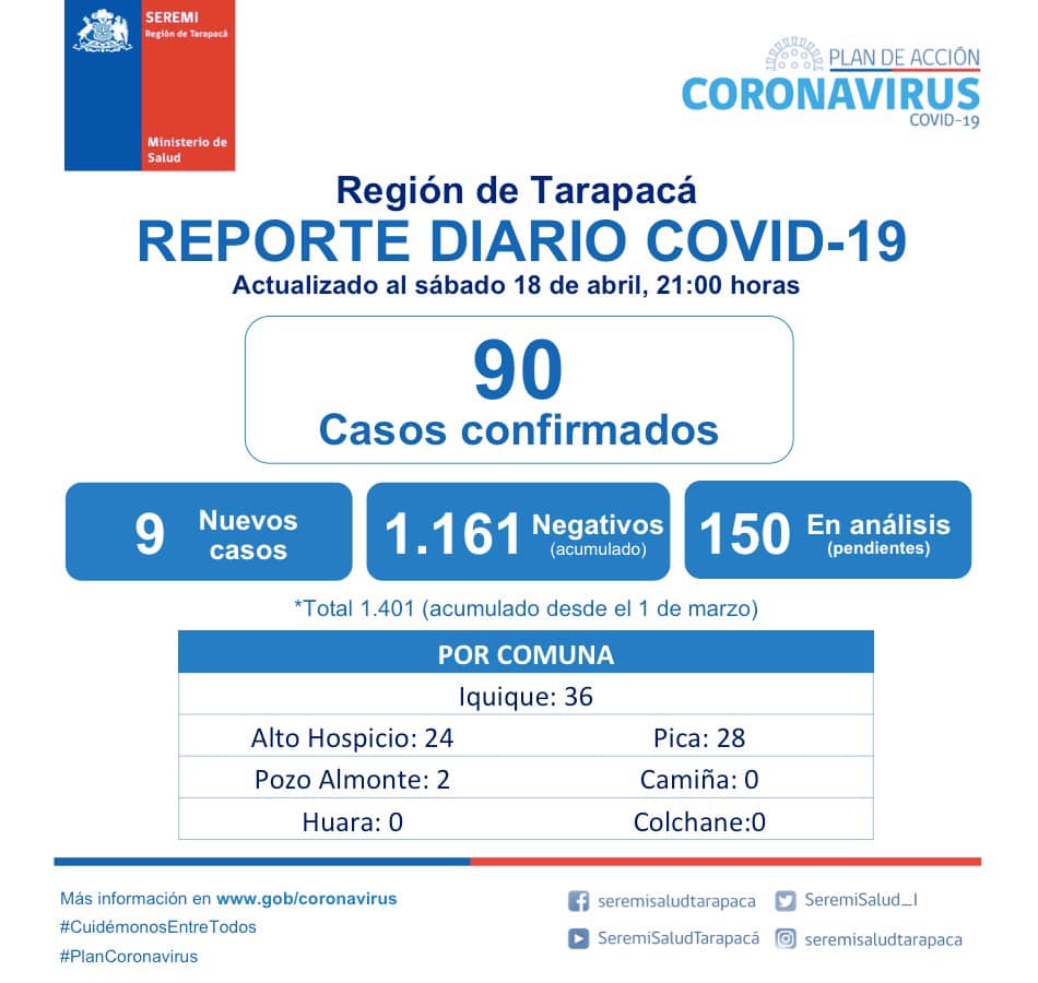 Las autoridades de la Primera Región encabezadas por el Intendente Miguel Angel Quezada, informaron que los casos de Covid-19 en Tarapacá llegan a 90.
