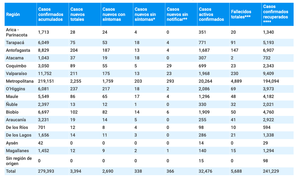 Además, el jefe del Minsal exhibió la tasa de incidencia, es decir, la cantidad de pacientes por 100 mil habitantes que están infectados, que a nivel nacional es de 168. «Sin embargo, quiero destacar, felicitar y apoyar a las regiones de La Araucanía, Los Ríos, Los Lagos y Aysén, donde ésta es muchísimo más baja, gracias a las medidas que se han tomado como Gobierno y la cooperación de la población», afirmó. Tras esa intruducción del secretario de Estado, la subsecretaria Paula Daza informó que hubo 113 fallecidos por covid.-19 inscritos en el Registro Civil, totalizando a la fecha 5.688. Las defunciones se concentraron casi en su totalidad en la Región Metropolitana: 112. El otro fallecimiento se reportó en la Región de Valparaíso.