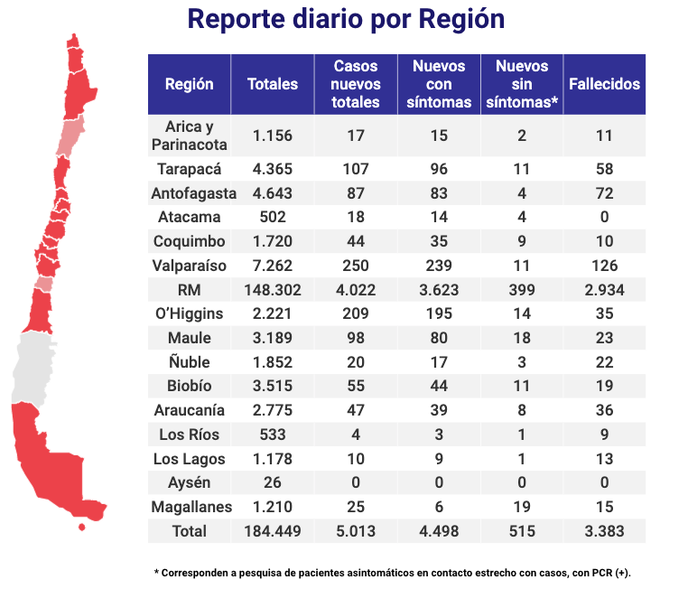 Respecto a las víctimas fatales, la subsecretaria de Salud Pública, Paula Daza informó de 21 muertes por coronavirus registradas en el Registro Civil, elevando el total nacional a 3.383 desde el inicio de la pandemia. Además, la autoridad sanitaria informó que hubo 5.013 casos nuevos en las últimas 24 horas, de los cuales 4.498 presentaron síntomas y 515 fueron asintomáticos, lo que da un total de 184.449 personas contagiadas desde el inicio de la crisis sanitaria, el pasado 3 de marzo. En tanto que los casos activos, es decir, capaces de trasmitir el virus suman 24.834.