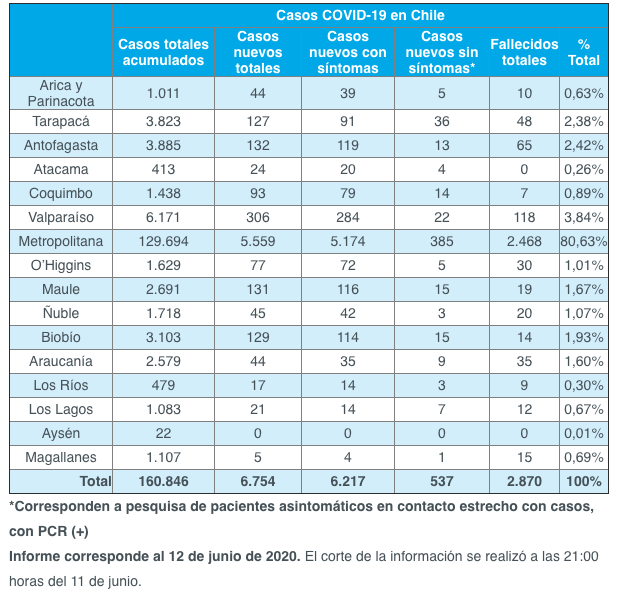 Asimismo, reportó 6.754 nuevos contagios en las últimas 24 horas, cifra récord en la crisis, de los cuales 6.217 son sintomáticos y 537, asintomáticos. Los casos activos, es decir, contagiantes, son 26.218. Mientras que el total de personas que han contraído el SARS-CoV-2 durante la pandemia que comenzó en el país el 3 de marzo, es de 160.846. «Hemos visto en los últimos días cómo ha ido creciendo esta situación, sobre todo en las regiones Metropolitana y de Tarapacá, donde hay cuarentena justamente para disminuir esta velocidad de contagios», indicó el titular de Redes Asistenciales. En tanto, los pacientes UCI son 1.647 a nivel nacional, de los cuales 1.391 están conectados a respiración artificial y 372 en estado crítico.