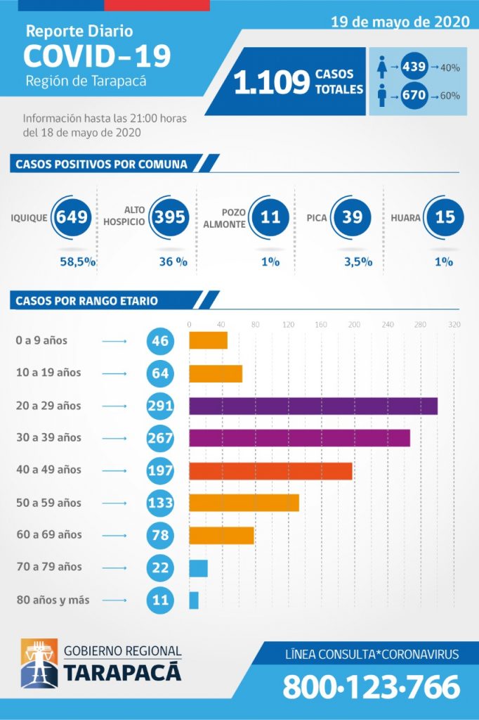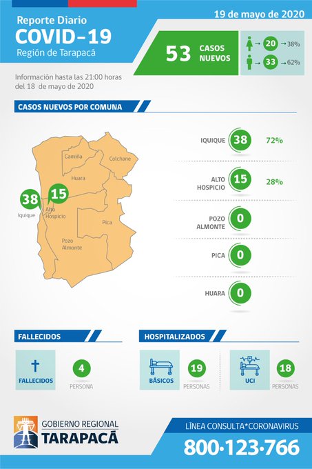 De los casos confirmados 38 son de la comuna de Iquique y 15 de Alto Hospicio. Por lo tanto, la región de Tarapacá llegó a 1.109 contagiados, con 4 fallecidos.