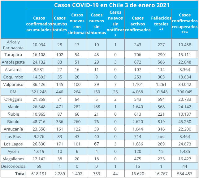 Según el reporte de hoy, hubo 2.289 casos nuevos de covid-19, de los cuales 1.492 corresponden a personas sintomáticas y 753 no presentan síntomas. Además, se registraron 44 test PCR positivos que no fueron notificados. La cifra total de personas que han sido diagnosticadas con covid-19 en el país alcanza a las 618.191. De ese total, 16.620 pacientes se encuentran en etapa activa.