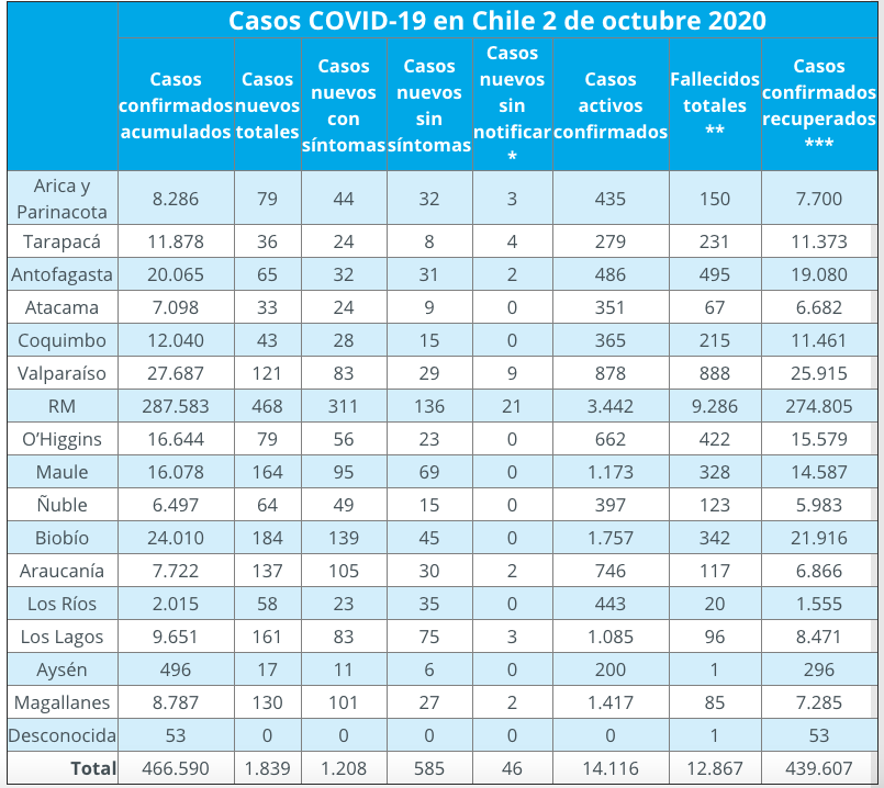Además, se reportaron 1.839 casos nuevos, de los cuales 1.208 presentaron sintomatología, 585 fueron asintomáticos y 46 no fueron notificados de su PCR positivo al Minsal. De esta forma, 466.590 personas han contraído el SARS-CoV-2 desde el inicio de la pandemia en marzo pasado, de los cuales 439.607 «se han recuperado». En tanto que los casos activos son 14.116, cifra que vuelve a superar el umbral de los 14 mil desde el 22 de septiembre, cuando hubo 14.059.