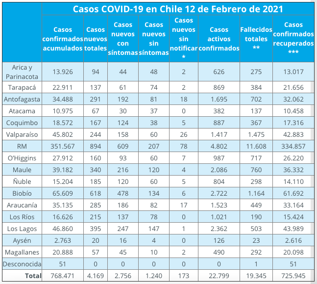 Este es el registro más alto de lo que va de la semana y la primera vez en cinco días que se superan los 4 mil casos. Con esto, la cifra total de fallecidos asciende a 19.345, mientras que la de contagiados a 766.471 desde que en marzo del año pasado comenzó la pandemia en Chile. En cuanto a exámenes, hubo 55.262 en las últimas horas, dando un total de 8.615.052 test realizados. Esto da una positividad diaria de 7,54%.