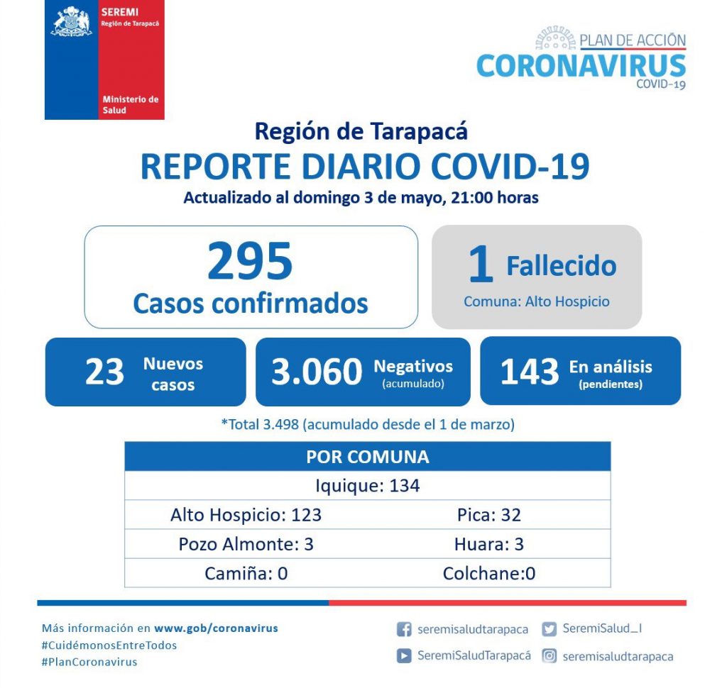En la primera región, el Intendente Miguel Ángel Quezada informó de23 nuevos casos (16 hombres y 7 mujeres) llegando el total a la fecha a 295 con 1 fallecido.