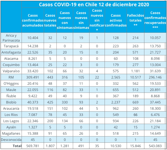 En el informe se reportaron 64 decesos y 1.807 nuevos casos en las últimas 24 horas. De los nuevos contagios, 1.281 son personas sintomáticas, 491 son asintomáticos, y 35 personas no han sido notificadas. Con esto, la cifra total de contagios en Chile es de 569.781, de los cuales 10.530 figuran como casos activos; mientras que otros 543.083 se han recuperado de la enfermedad.