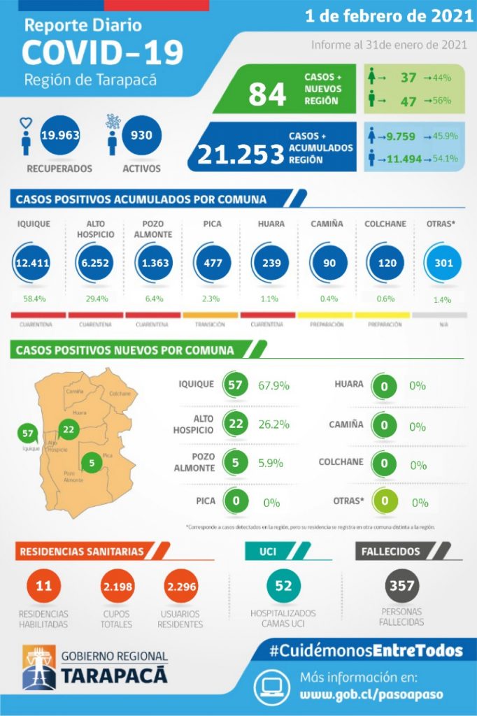 En relación a la red integrada a nivel nacional, existen 196 camas críticas disponibles. La autoridad añadió que el Departamento de Información y Estadísticas del Minsal dio a conocer que hasta ayer a las 22 horas, 56.371 personas ya han sido vacunadas con una primera dosis, y 10.352 con ambas dosis. Finalmente, en cuanto a las residencias sanitarias, sostuvo que hay 160 recintos disponibles, con una capacidad de 11.919 cupos, de los cuales 8.155 están ocupados.