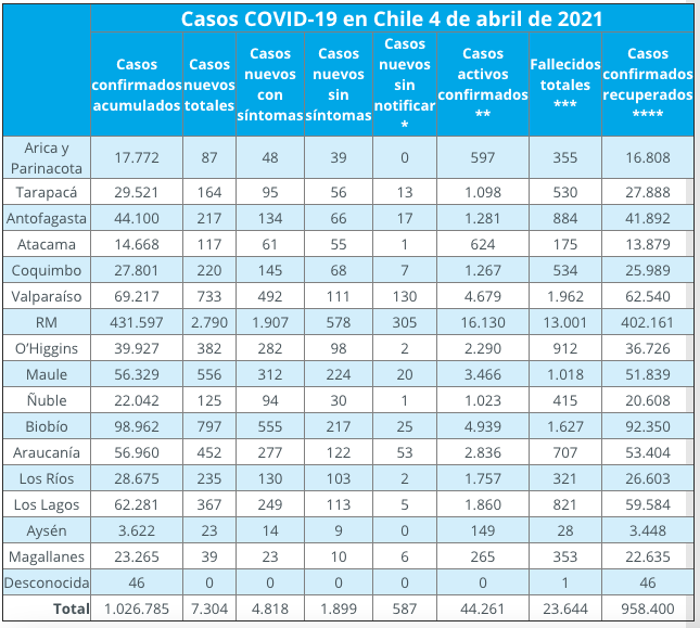 El Ministerio de Salud reportó hoy, 4 de abril, 7.304 nuevos casos en las últimas 24 horas y 120 decesos por covid-19 inscritos por el Registro Civil, de acuerdo a la información entregada por el Departamento de Estadística e Información de Salud (DEIS), lo que eleva el total nacional de fallecidos a 23.644 desde que se detectó el primer contagio en el país.