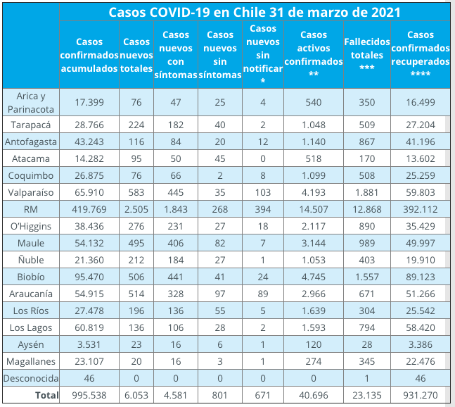 Los casos activos confirmados, es decir, aquellos portadores del virus SARS-CoV-2 y que son capaces de transmitirlo, son 40.696. Desde el inicio de la pandemia, el Minsal ha contabilizado el contagio de 995.538 personas, de las cuales 931.270 se consideran «recuperadas».