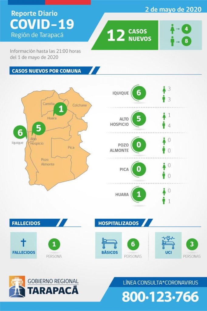 El Intendente Miguel Ángel Quezada informó 12 nuevos casos de Covid-19 en la Primera Región, de los cuales 6 son de Iquique y 5 de Alto Hospicio. Uno de los 12 nuevos casos es de Huara, aunque se dijo que se trata de un desplazado, situación que el Servicio de Salud investiga.