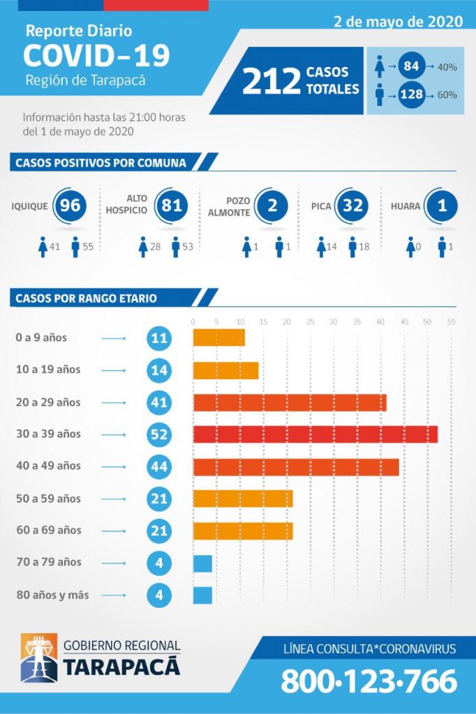 Esta comuna pampina no registraba a la fecha ningún caso tal con Camiña y Colchane. A la fecha Tarapacá lleva 212 casos de Covid-19, con 1 fallecido y 124 recuperados.