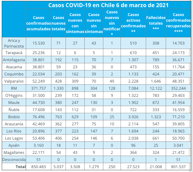 El Ministerio de Salud reportó hoy, 6 de marzo, 80 nuevos decesos por covid-19 inscritos por el Registro Civil, de acuerdo a la información entregada por el Departamento de Estadística e Información de Salud (DEIS), lo que eleva el total nacional a 21.008 desde que se detectó el primer contagio en el país.