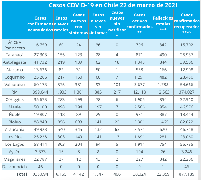 Un total de 6.155 casos nuevos de covid-19 se registraron en las últimas 24 horas en el país, según informó este lunes el Ministerio de Salud. Del total de nuevos contagiados, 4.142 son personas que presentan síntomas y 1.547 son asintomáticas. Con esto, los casos acumulados desde el inicio de la pandemia ascienden a 938.094, mientras que los casos activos –que pueden contagiar a otras personas– llegan actualmente a 38.024, la cifra más alta en toda la pandemia.