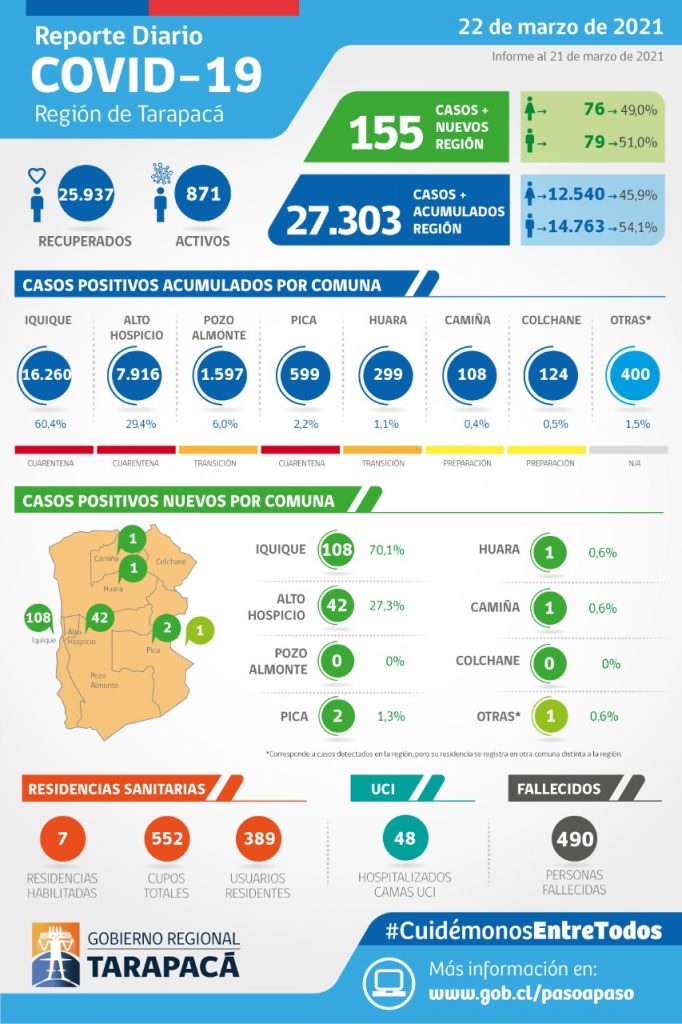 El Minsal informó además que en las últimas horas fallecieron 80 personas por causas asociadas a covid-19, con lo que el número total de víctimas llega a 22.359. En cuanto a los pacientes más graves, hay 2.269 personas internadas en una unidad de cuidados intensivos, y de ellas 1.973 están conectadas a un ventilador mecánico. Actualmente, hay disponibles 177 camas críticas en el país.