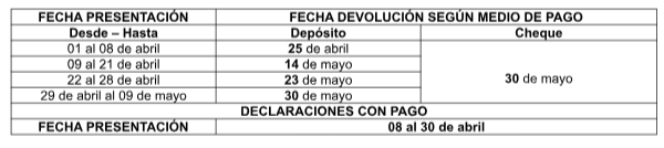 En concreto, de estar correcto lo declarado en el Formulario 22 y en caso de corresponder una devolución de impuestos, a quienes realizaron la declaración entre el 01 y 08 de abril se les transferirá el 25 de abril de haber solicitado depósito a su cuenta bancaria o bien el 30 de mayo para aquellos que pidieron recibir los recursos a través de cheque.