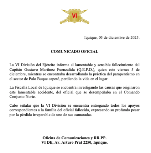 La víctima resultó ser el capitán Gustavo Martínez Fuenzalida. Un comunicado oficial de la VI División del Ejército da cuenta de este lamentable accidente.