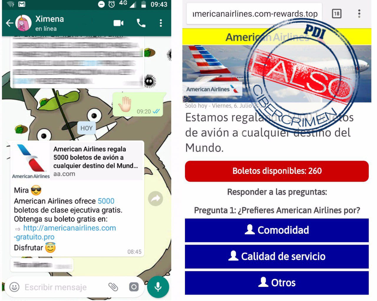La Policía de Investigaciones de Iquique (PDI) a través de la Brigada Investigadora de Delitos Económicos (Bridec), alerta a la comunidad referente a mensajes o links de promociones de aerolíneas, vía modalidad WhatsApp o correo electrónico que son falsos, ya que no corresponden a ofertas o avisos publicitarios emitidos por ellas.